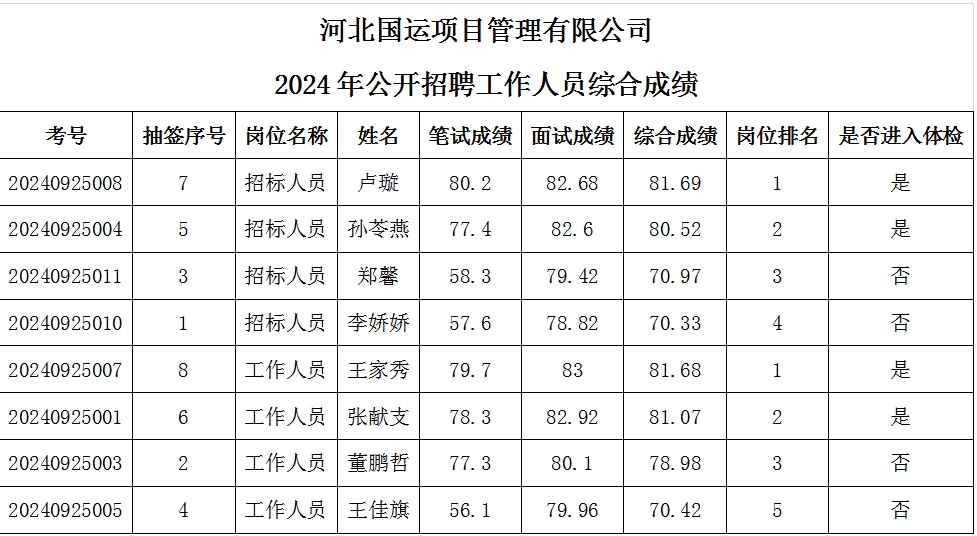 根據(jù)《河北國(guó)運(yùn)項(xiàng)目管理有限公司公開(kāi)招聘工作人員招聘公告》規(guī)定,河北國(guó)運(yùn)項(xiàng)目管理有限公司2024年公開(kāi)招聘工作人員面試于2024年9月25日完成?,F(xiàn)將綜合成績(jī)及進(jìn)入體檢人員名單進(jìn)行公示。
